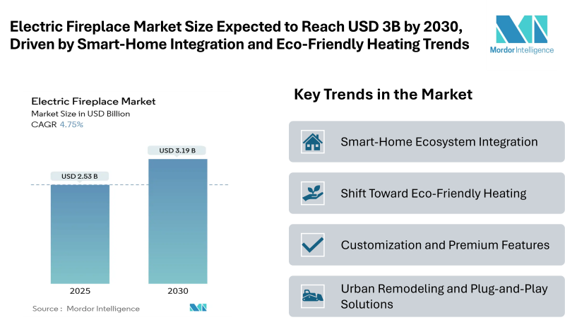 Electric Fireplace Market Size Expected to Reach USD 3.19 Billion by 2030, Driven by Smart-Home Integration and Eco-Friendly Heating Trends