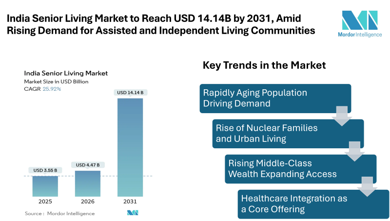 According to Mordor Intelligence, the India senior living market size was valued at USD 3.55 billion in 2025 and is estimated to grow from USD 4.47 billion in 2026 to reach USD 14.14 billion by 2031, registering a CAGR of 25.92% during the forecast period (2026–2031). The India senior living market is entering a high-growth phase, driven by demographic change, urban migration, and rising household incomes.