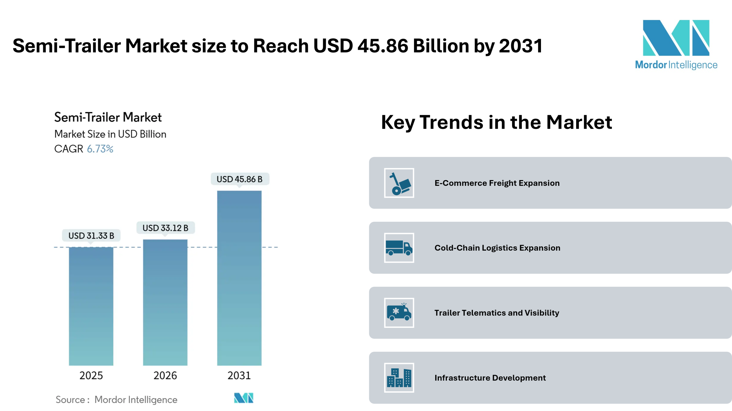 According to Mordor Intelligence, the semi-trailer market size is projected to grow from USD 33.12 billion in 2026 to USD 45.86 billion by 2031, reflecting steady semi-trailer market growth during the forecast period. The semi-trailer market forecast highlights sustained demand across logistics, cold-chain transportation, and infrastructure-linked freight movement.