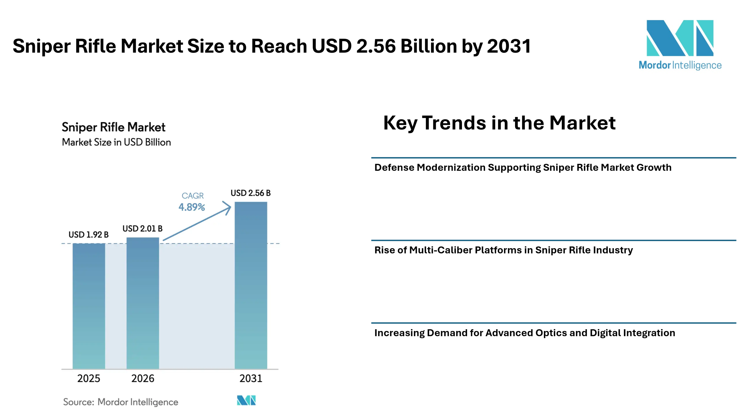 According to Mordor Intelligence, the sniper rifle market size is estimated at USD 2.01 billion in 2026, increasing from USD 1.92 billion in 2025, and is projected to reach USD 2.56 billion by 2031, reflecting a CAGR of 4.89% during the forecast period.